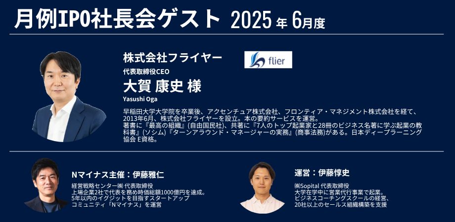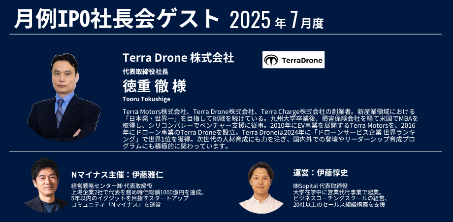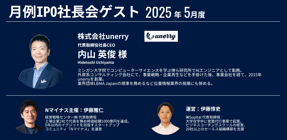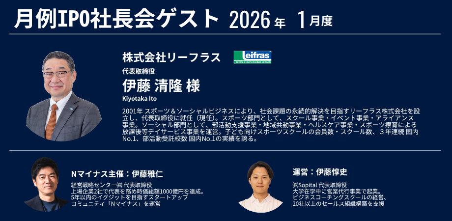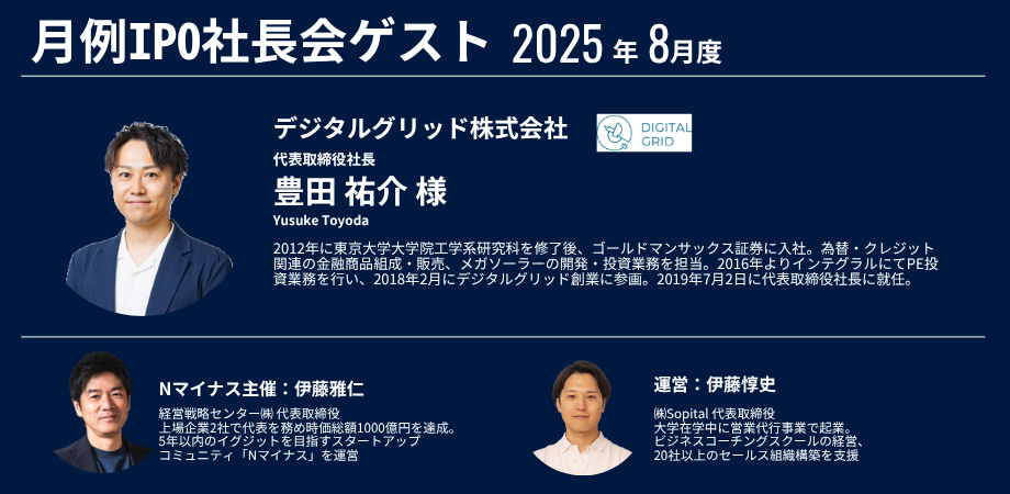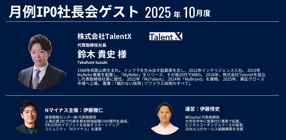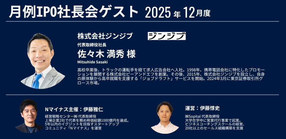 伊藤雅仁氏と共同で運営するNマイナス(5年以内のイグジットを目指すスタートアップコミュニティ)と株式会社Sopitalが共同主催する上場企業の経営者などを招いたセミナーイベント。